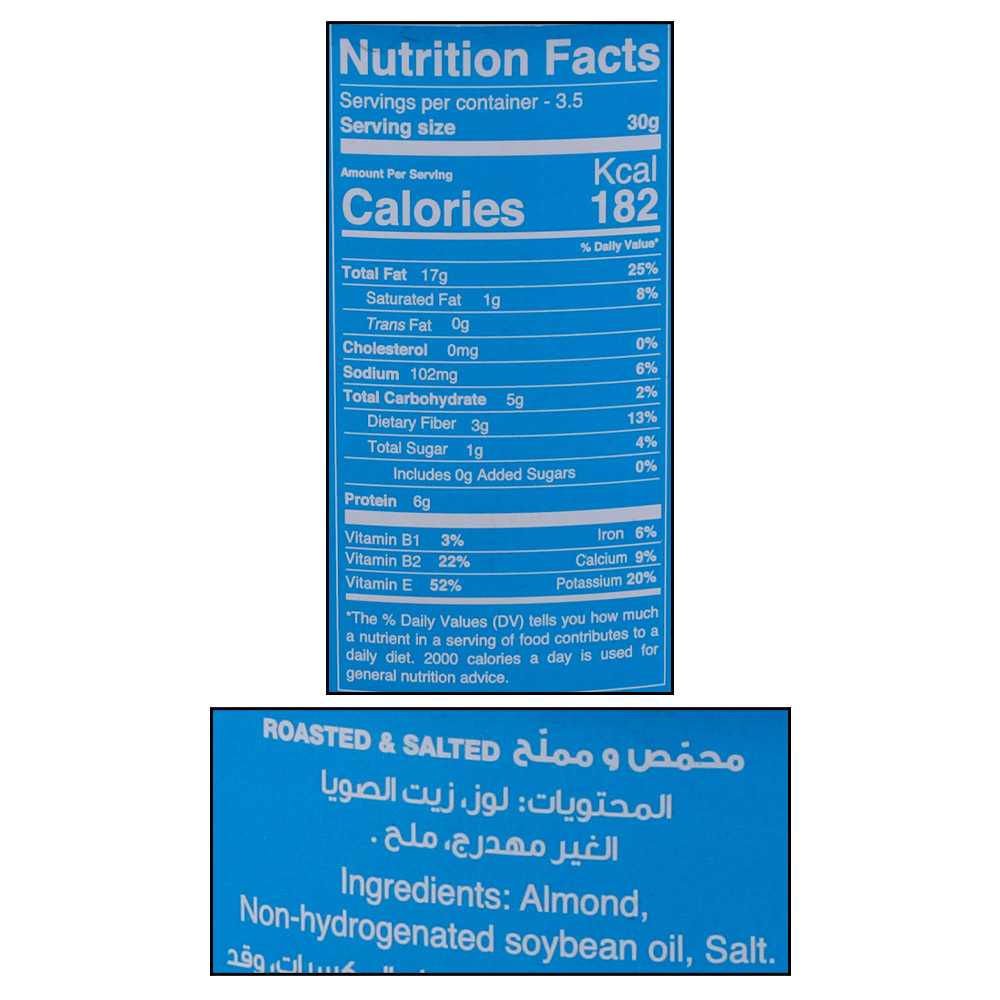 These salted almonds are carefully seasoned to enhance their natural flavor, offering a delicious and savory snacking experience. Packed in a convenient 110g can, theyre perfect for sharing or enjoying solo, and easy to store for anytime access. Rich in healthy fats, they make a wholesome addition to a balanced diet.